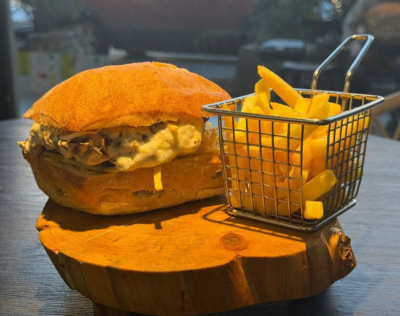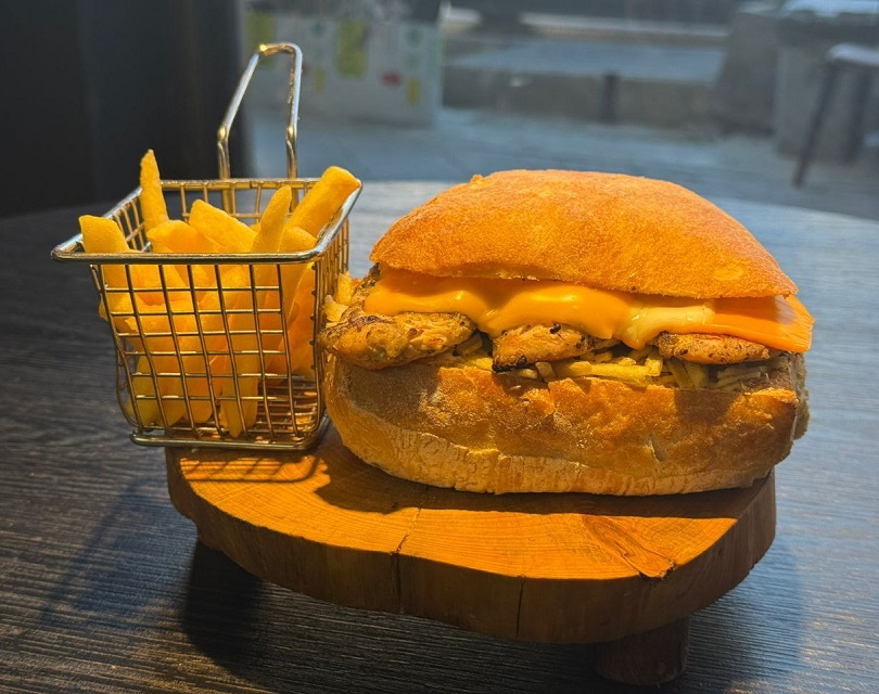 فیله مرغ ذغالی + پنیر گودا + پنیر چدار + پنیر ورقه سفید + سس قارچ + چیپس خلالی + سیب زمینی سرخ شده