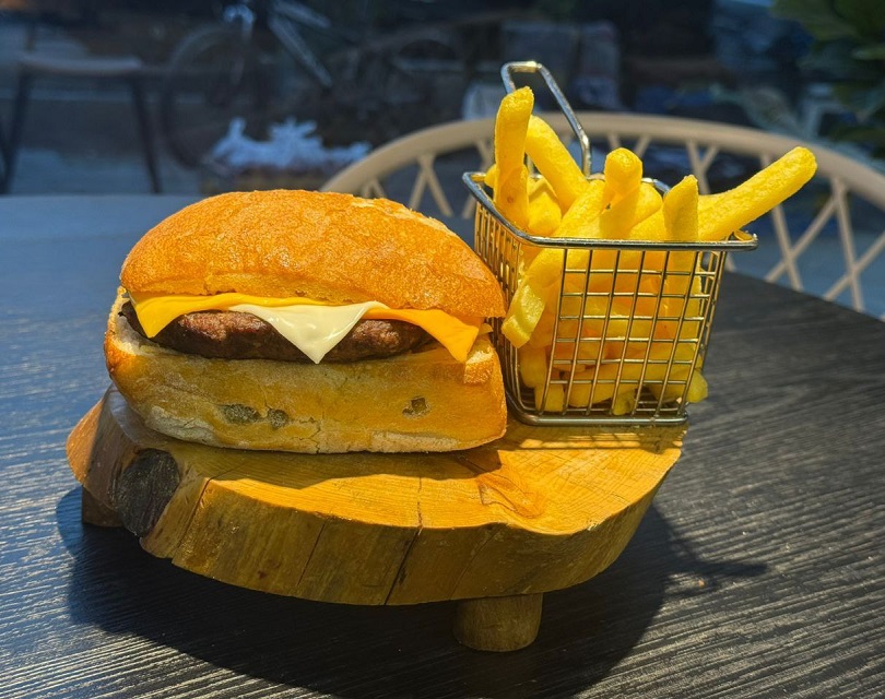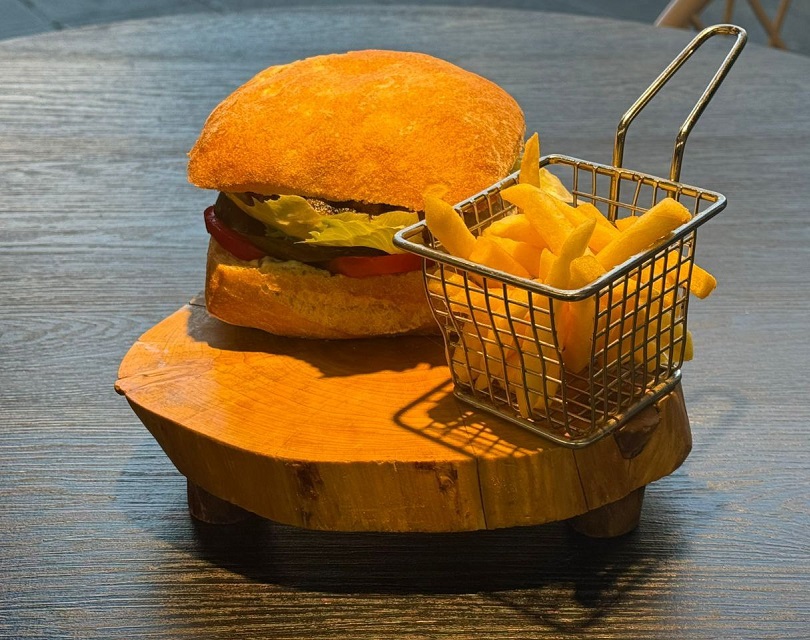 گوشت سرد گوساله و گوسفندی + گوجه فرنگی + کاهو + خیارشور + سس مخصوص برگر ذغالی 1379 + سیب زمینی سرخ شده