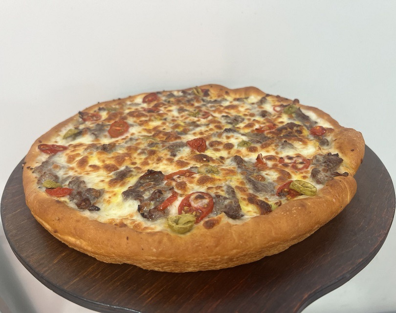 سس پامادور + بیفتک + رست بیف + قارچ پخته + پنیر پیتزا موزارلا میکس +سینه مرغ سزار + استیک سیر + یک سیخ قارچ کبابی + یک سیه گوجه و فلفل کبابی