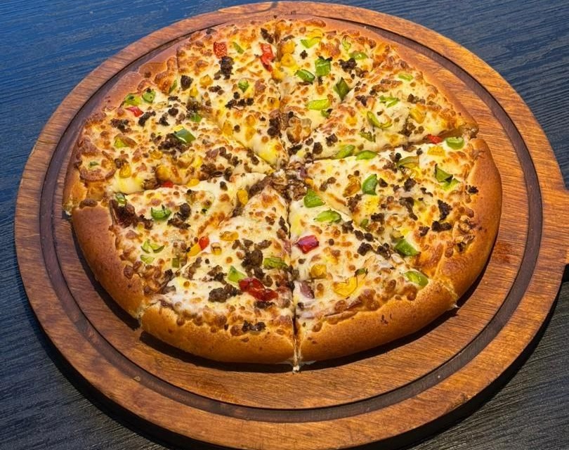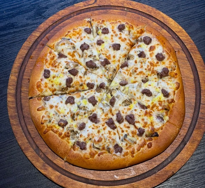 سس آویشن + ژامبون مرغ + ژامبون گوشت + پپرونی+ رست بیف + قارچ تازه + فلفل دلمه + گوشت چرخ کرده + ذرت + پنیر پیتزا موزارلا میکس