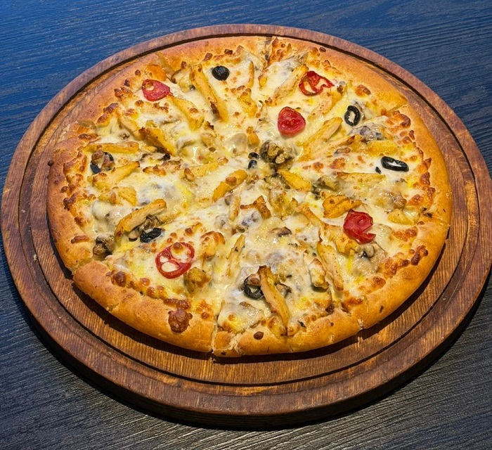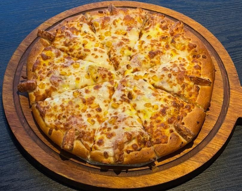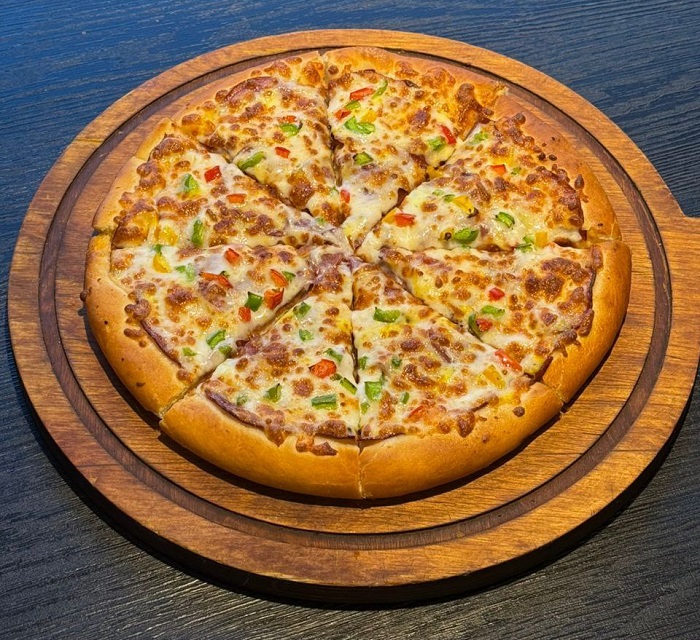 سس آویشن + ژامبون مرغ + مرغ پخته + قارچ پخته + ژامبون گوشت + بیکن + ذرت + سوسیس پنیری + پنیر پیتزا موزارلا میکس
