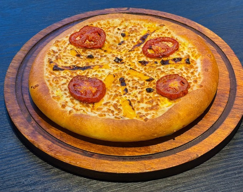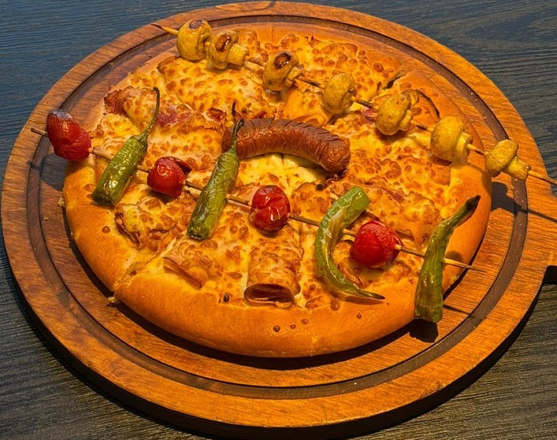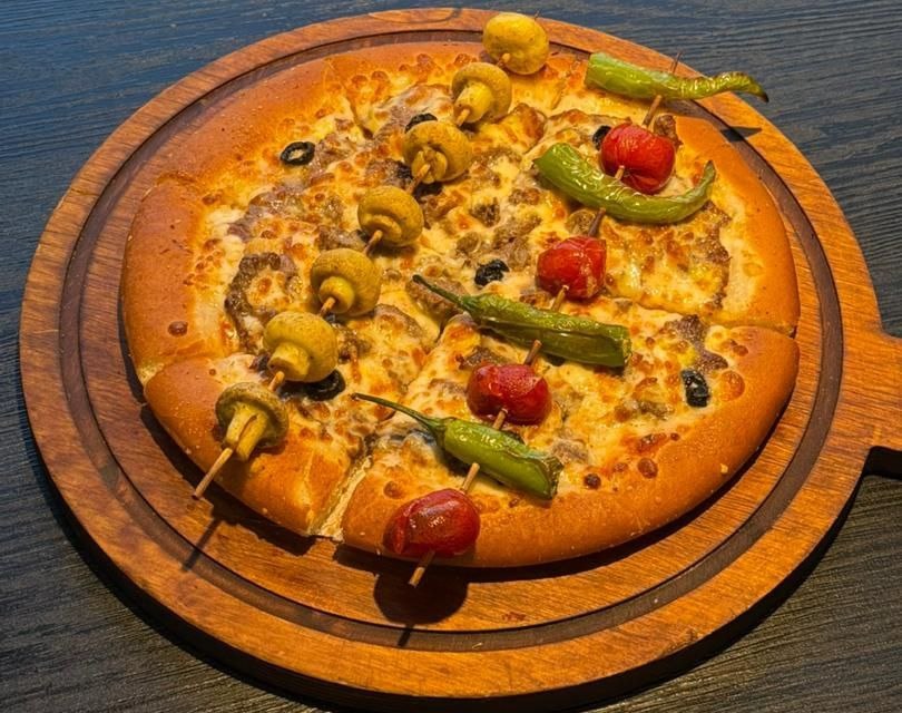 سس پامادور + استیک سیر + پنیر پیتزا موزارلا میکس + پنیر پارمیزان + زیتون اسلایس مشکی + یک سیخ قارچ کبابی + یک سیخ گوجه و فلفل کبابی