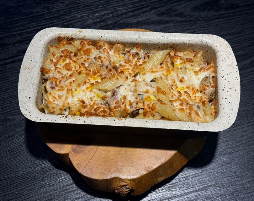 گوشت سردست گوساله و گوسفندی + سس قارچ + سس گردو + پنیر موزارلا + پنیر چدار + چیپس