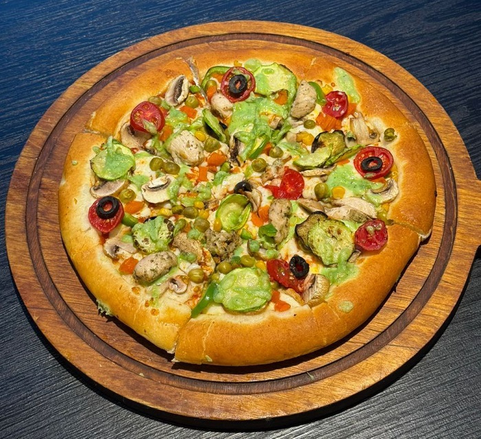 سس پستو + قارچ پخته + کدو + بادمجان + کوکتل سبزیجات + زیتون اسلایس + گوجه گیلاسی + فیله مرغ کبابی + پنیر پستو