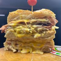 ژامبون مرغ و گوشت تنوری با قارچ و پنیر، رست بیف و مرغ پخته،چیپس خلالی،سس پنیر
